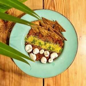 Crumb fried mashed Potato patties over a savoury yellow pea sauce & garnished with Sev, Chutneys & Anaar.