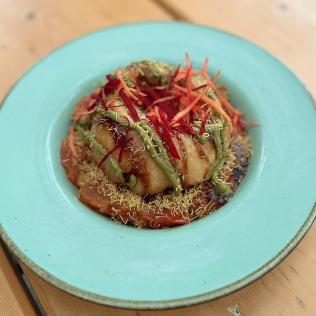 Crunchy Kachori stuffed with chickpeas, lentils and yoghurt, served on a bed of tomato & raisin sauce. Topped with Chutneys & Sev. Yumm!