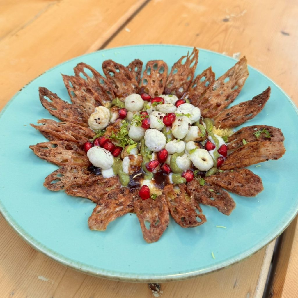 Crispy & spicy Lotus Stem chips with roasted Makhana in a sweet & tangy yoghurt sauce.
